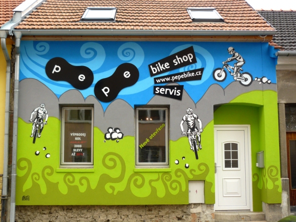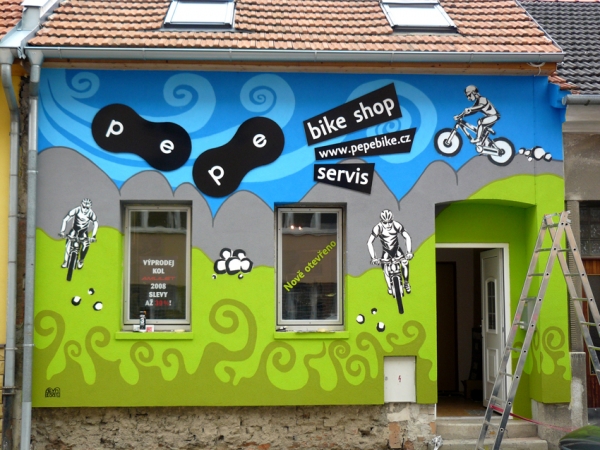 Umělecké ztvárnění fasády PE-PE bike shopu v Brně - návrhy a relizace