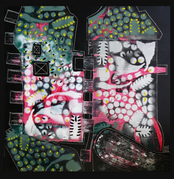 Malby jsou kombinované například s rytou fotkou, koláží, sprejovanými částmi atd.